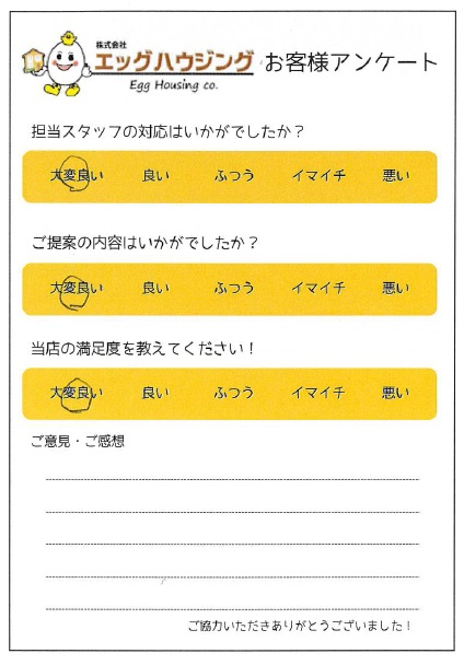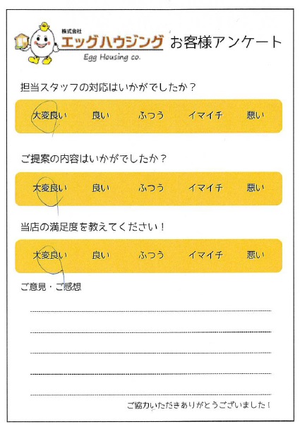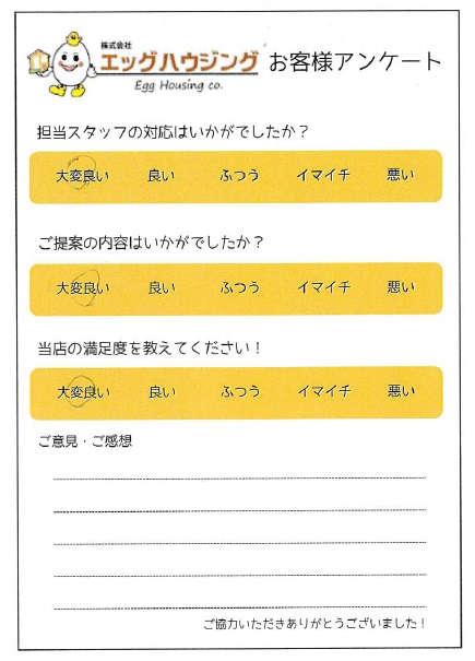 W様、この度はお引渡し誠におめでとうございます!スムーズに引き渡しができてホッとしております(*^_^*) また何かございましたらお気軽にご連絡ください♪ 担当 松尾